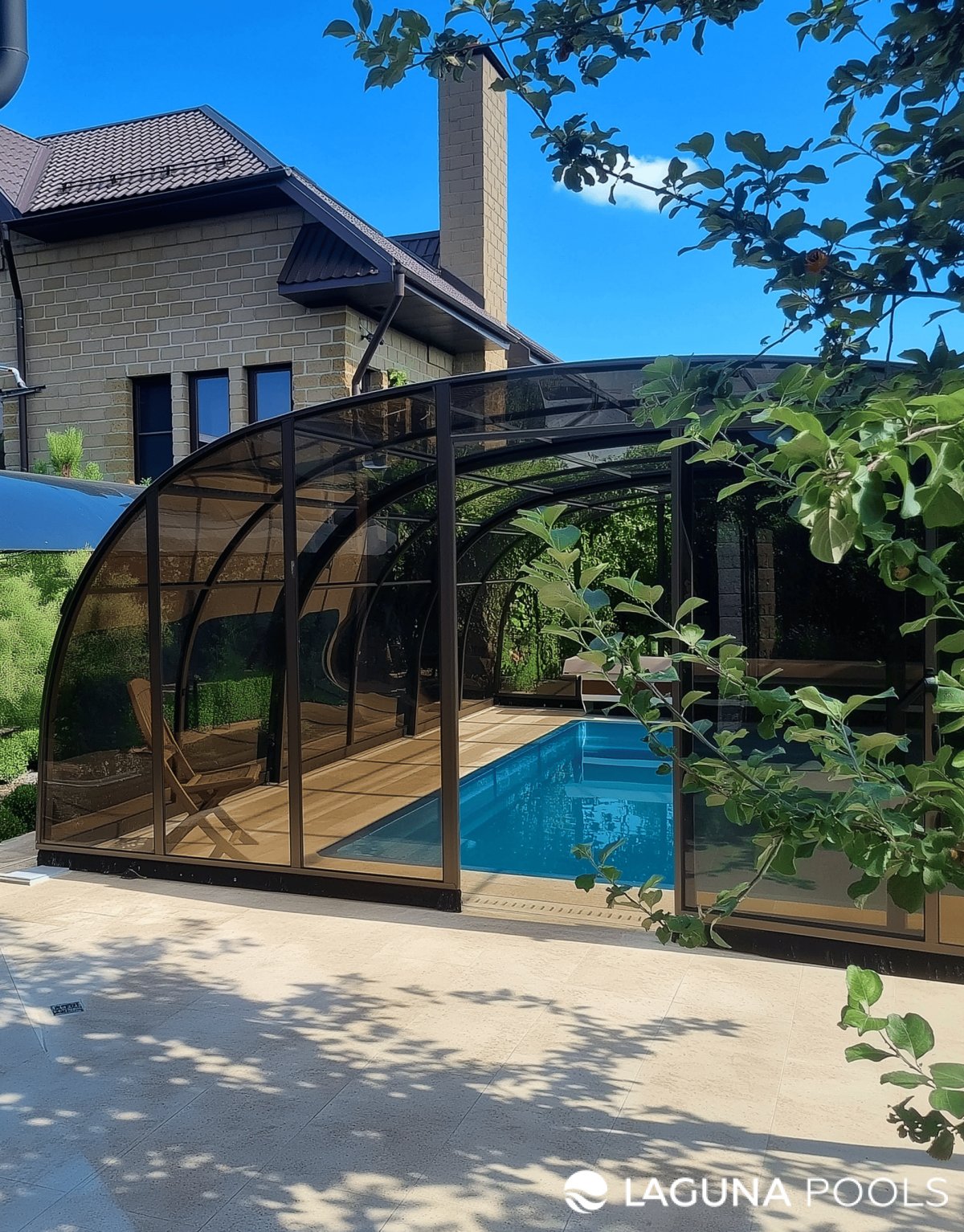 Открытый бассейн с тонированным поликарбонатным павильоном и деревянным настилом размещён на придомовой территории с зелёными насаждениями.
