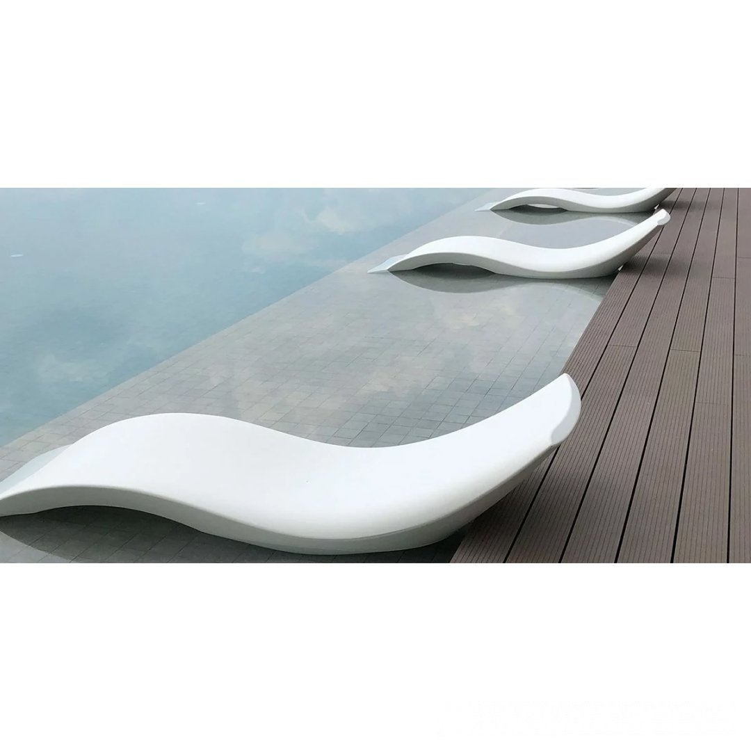 Белые эргономичные шезлонги частично погружены в воду у бассейна с тёмной композитной террасой.